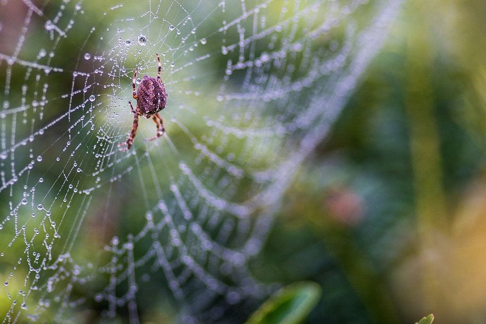 Früh am Morgen kann man die Spinnen gut sehen. Makro-Foto. Spinnennetz.