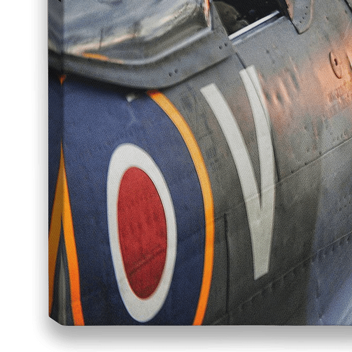 Bestelle das Foto Spitfire mit Flammen von Atelier Liesjes als Reproduktion auf Leinwand, Alu-Dibond, als Poster, Fototapete oder Acrylglasbild.