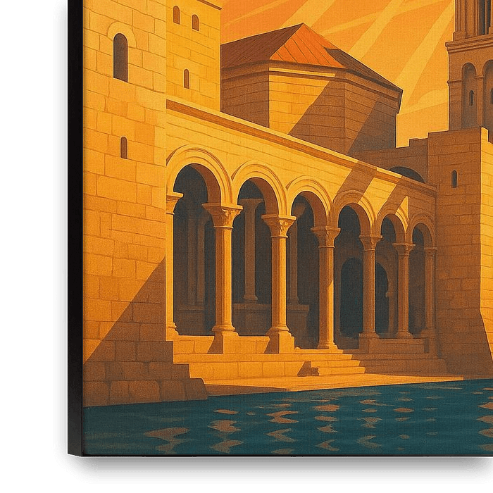 Bestelle dieses Landschafts-Wandbild Split Kathedrale Sonnenuntergang Art Deco Poster von Travel Shop als Reproduktion auf Leinwand, Alu-Dibond, als Poster, Fototapete oder Acrylglasbild.