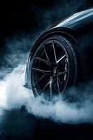 Bestelle das Foto Sportwagenrad in Rauchwolke von Poster Art Shop als Reproduktion auf Leinwand, Alu-Dibond, als Poster, Fototapete oder Acrylglasbild.