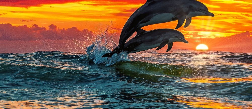 Die intensiven Rot-, Orange- und Violetttöne lassen den Himmel fast in Flammen aufgehen, während die Spiegelung auf dem Wasser einen hypnotisierenden Effekt erzeugt. Die Delphine, anmutig und energisch, sind das dynamische Herzstück der Komposition.