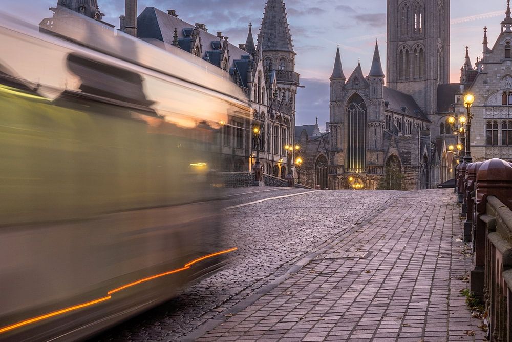 Neben der St. Michaelskirche befindet sich die St. Michaelsbrücke mit den schönen Türmen der Artevelde-Stadt Gent während der goldenen Stunde.