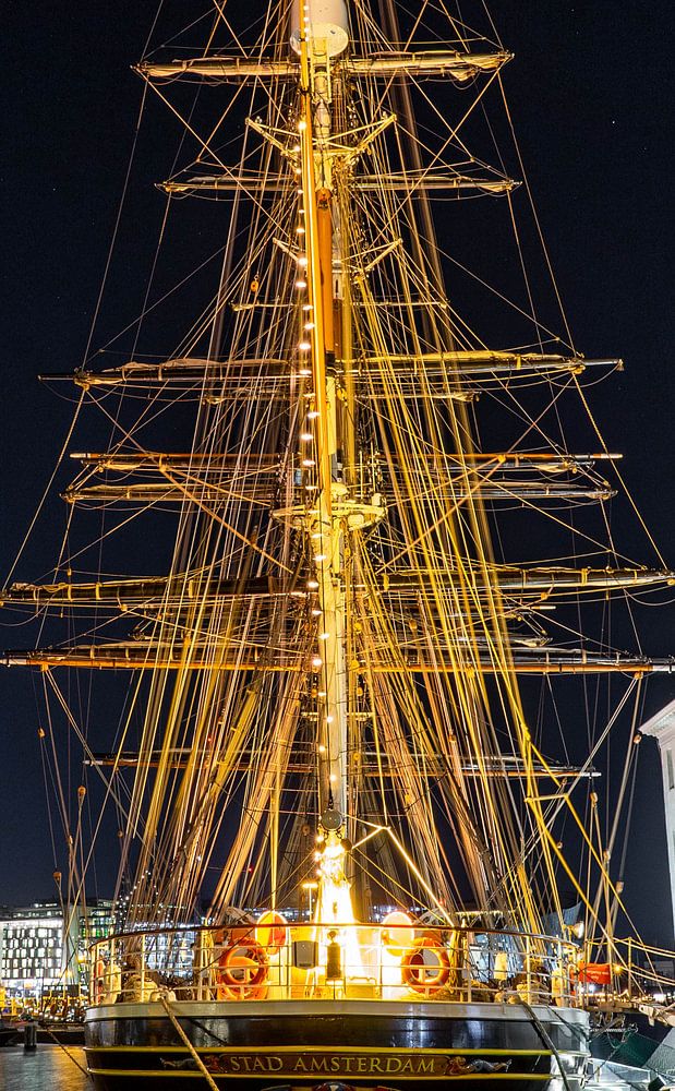 Dieser Großsegler 'Stad Amsterdam' liegt vorübergehend vor dem Maritimen Museum in Amsterdam fest. Sie ersetzt die "Amsterdam", die V.O.C.-Replik, die in der Wartung ist.