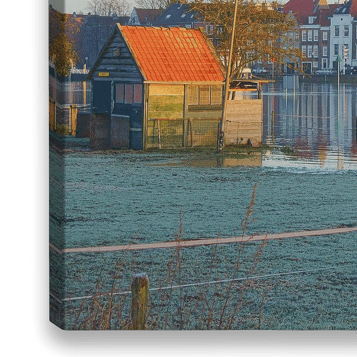 Foto aus Deventer, Overijssel. Sonniger Start in einen kalten Tag auf der IJssel in Deventer mit ruhigem Wasser und blauem Himmel. Die Stadt am Fluss leuchtet orange von der tief stehenden Sonne.