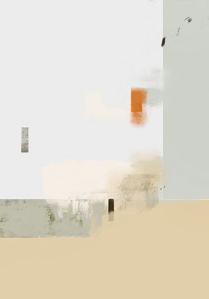 Ein Meisterwerk, das zeitgenössischen urbanen Minimalismus und emotionale Fluidität verkörpert. Die Leinwand wird von weitläufigen, transparenten Off-White- und sanften Hell-Khaki-Tönen getragen, die an die ruhige Atmosphäre einer Stadt in der Morgen- oder Abenddämmerung erinnern. Asymmetrische Blöcke in Orangerot, Dunkelgrau und Braun…