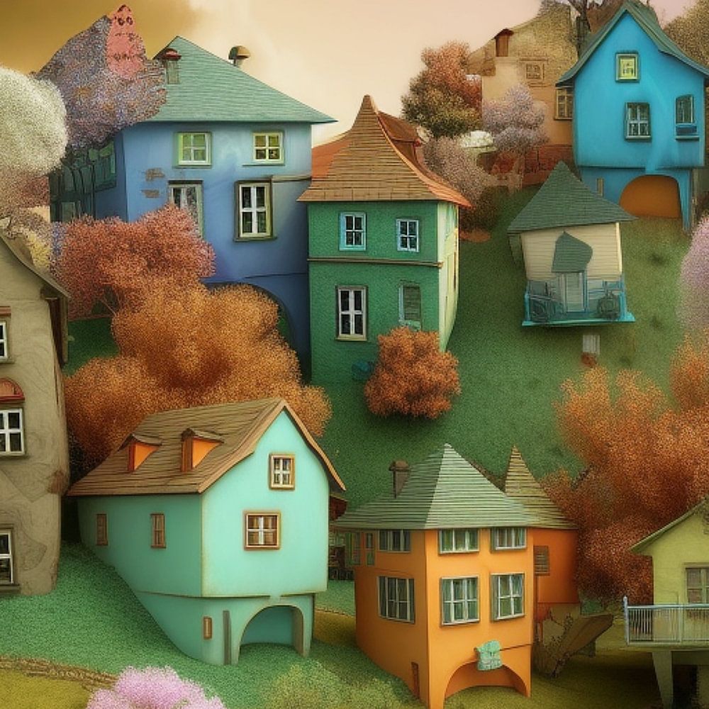 Ein charmantes Ensemble farbenfroher Häuser schmiegt sich an die sanften Konturen eines grünen Hügels unter einem dramatischen Himmel in warmen Abendtönen. Jedes Haus präsentiert sich in einer eigenen, lebendigen Farbe, umgeben von stilisierten Bäumen in herbstlichen und frühlingshaften Nuancen. Ein gewundener Pfad schlängelt sich durch die Szene und verbindet die einzelnen Behausungen. Die Szenerie wirkt wie eine Illustration aus einem Märchenbuch, eine friedliche und leicht surreale Welt, die zum Träumen einlädt. Die verspielte Anordnung und die leuchtenden Farben erzeugen eine heitere Atmosphäre.