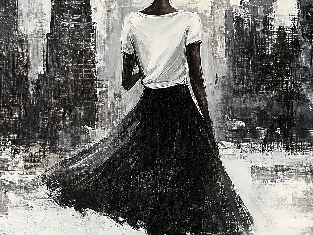 Sie trägt ein weißes T-Shirt unter einem schwarzen langen Rock und hohe Absätze und hat ihr dunkles Haar zu einer raffinierten Hochsteckfrisur hochgesteckt. Ihre Figur hebt sich deutlich von der dunstigen Stadtlandschaft ab und unterstreicht ihre Bewegung und Eleganz. Die Kontraste zwischen ihrer Kleidung und dem Hintergrund verleihen dem Bild Tiefe und lassen die Frau als ruhige, aber kraftvolle Erscheinung inmitten der Stadt erscheinen.