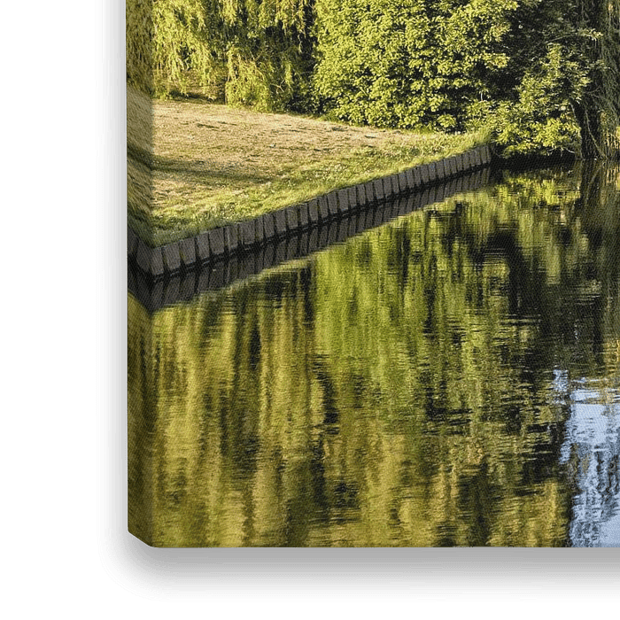Foto eines Stadtwassers im Frühling, eingerahmt von schönen Bäumen und Spiegelung im Wasser