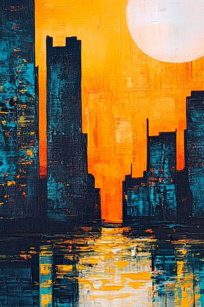 Ein majestätisches Farbenspiel aus orangen und blauen Tönen erweckt die Silhouette einer pulsierenden Stadt zum Leben. Der Sonnenuntergang reflektiert sich im Wasser, während Vögel friedlich den Himmel durchqueren. Diese dynamische Szene verleiht jedem Wohnzimmer einen Hauch von urbaner Eleganz und bringt eine gefühlvolle Atmosphäre in den Raum.