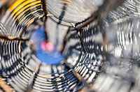 Ein fast abstraktes Bild von einem Stapel von Rohrbewehrungsnetzen für Betonsäulen, hergestellt auf einer Baustelle an einem schönen Frühlingstag.