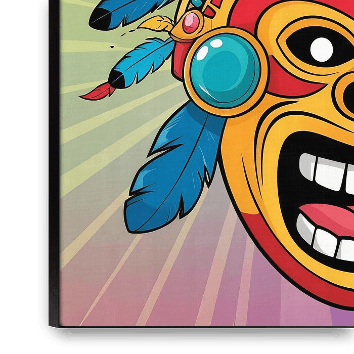 Eine lebendige Illustration einer Stammesmaske mit einem breiten, zahnlosen Grinsen. Die Maske ist überwiegend gelb mit roten und blauen Akzenten und verfügt über einen großen, verzierten Kopfschmuck, der mit bunten Federn geschmückt ist. Der Hintergrund ist ein Farbverlauf aus Gelb, Orange und Violett mit strahlenförmigen Linien, die…