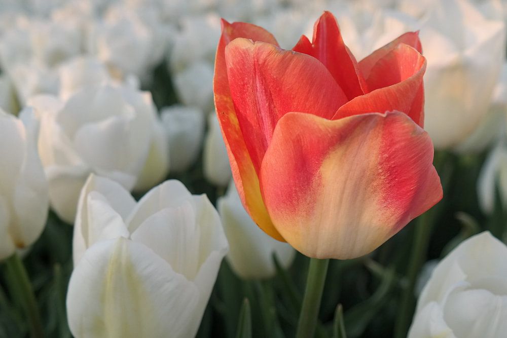 Orangene Dynastie in einem Meer aus weißen Tulpen der Dynastie