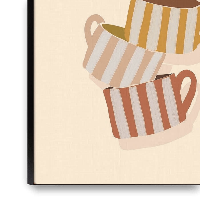 Eine fröhliche Ode an Kaffee- und Teemomente in Farbe! Sechs gestreifte Tassen - in Olivgrün, Salbeigrün, Altrosa, Ockergelb, Blassrosa und Terra - balancieren spielerisch übereinander. Der zartrosa Hintergrund lässt das Ganze leicht und einladend wirken. Diese Illustration wird Ihnen ein Lächeln ins Gesicht zaubern und ist perfekt für…
