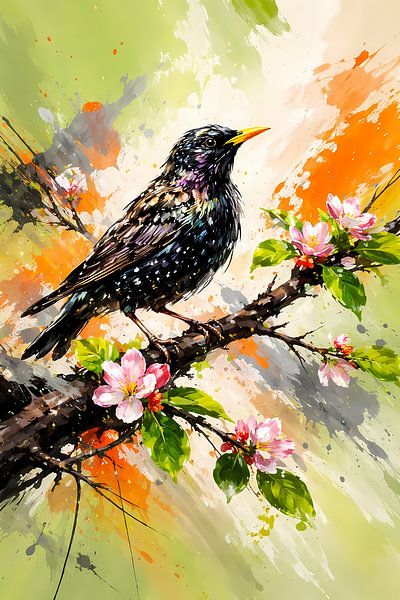 Ein lebhafter Star sitzt auf einem mit rosa Blüten geschmückten Ast. Der Hintergrund ist mit orangefarbenen und grünen Sprenkeln versehen, die dem Bild eine dynamische Note verleihen.