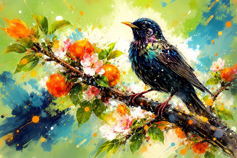 Ein lebhafter Star sitzt auf einem Ast, der mit rosa Blüten und Orangen geschmückt ist. Der Hintergrund ist mit orangefarbenen und grünen Sprenkeln versehen, die ihm eine dynamische Note verleihen.
