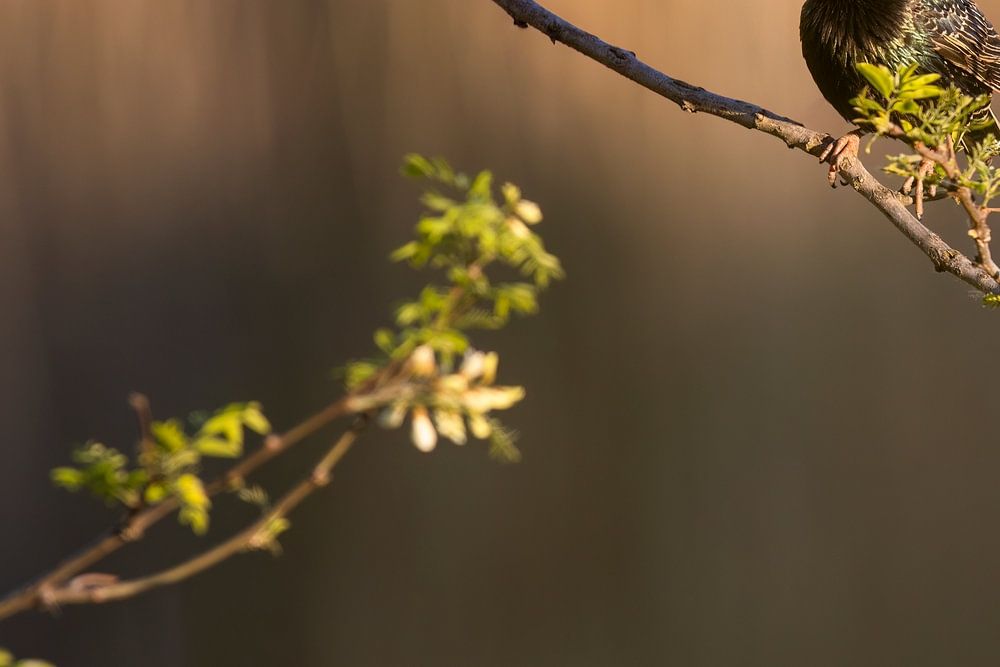 Ein Star genießt die ersten wärmenden Sonnenstrahlen auf einem blühenden Robinienast.