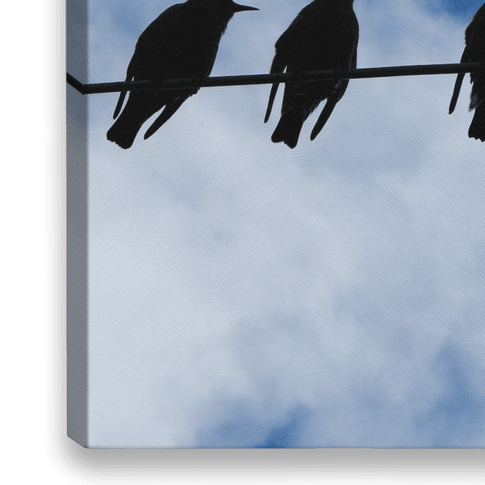 Schwarze Silhouetten von Staren auf einem Telefonkabel vor einem blauen Himmel mit weißen Wolken.