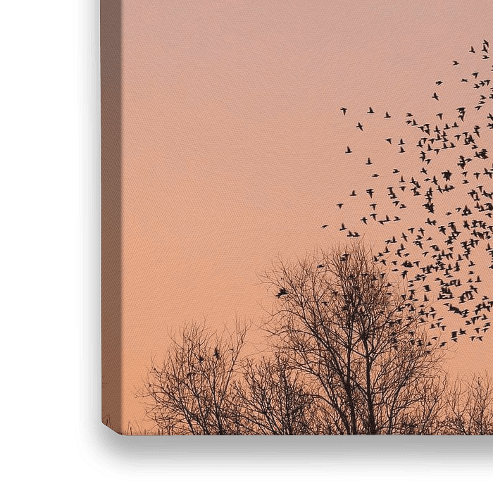 Das Gemurmel der Stare am klaren Himmel während eines ruhigen Sonnenuntergangs am Ende des Tages. Riesige Gruppen von Staren am Himmel, die sich in formverändernden Wolken bewegen, bevor sie für die Nacht in den Bäumen landen.