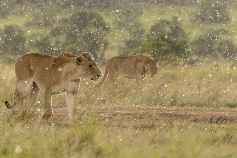 Bestelle dieses Löwen-Wandbild Start der Jagd im Regen. von Martine Oortwijn als Reproduktion auf Leinwand, Alu-Dibond, als Poster, Fototapete oder Acrylglasbild.