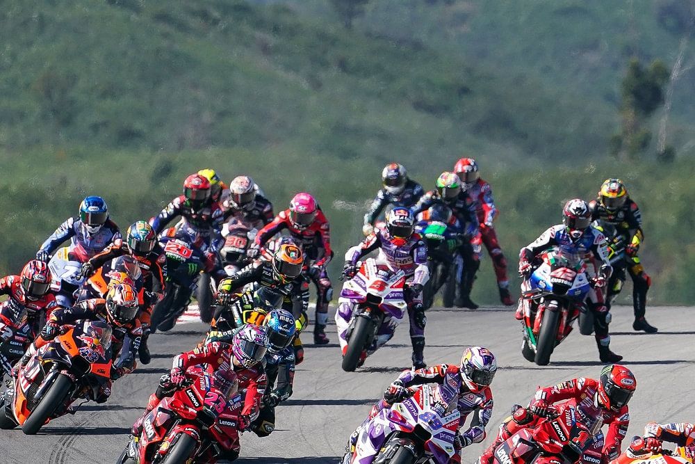 Start des MotoGP Sprintrennens, mit Marc Marquez, Francesco "Pecco" Bagnaia, Jorge Martin und Enea Bastianini auf den ersten Plätzen. Francesco "Pecco" Bagnaia würde das Sprintrennen gewinnen