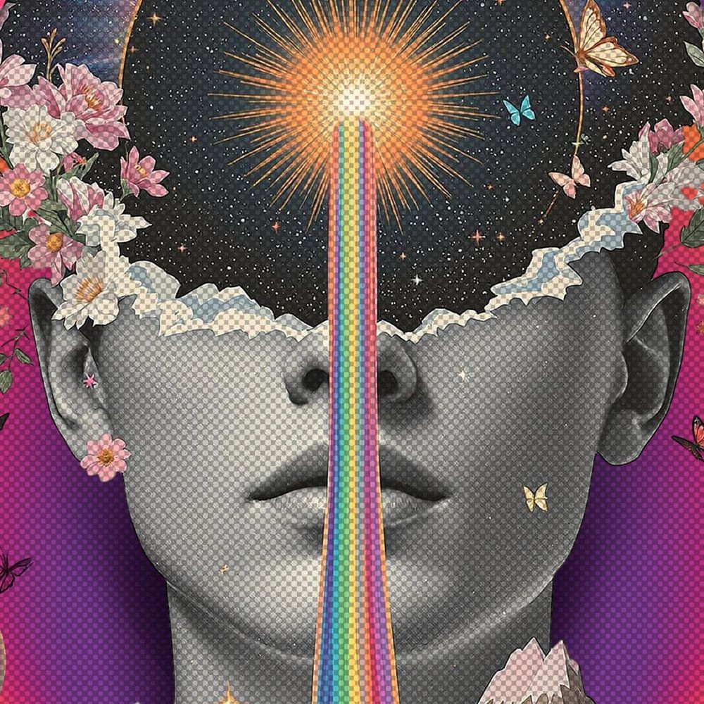 Ein kosmisches und lebendiges Werk mit Regenbogen-Lichtstrahlen, psychedelischen Landschaften und einem heiteren Gesicht. Das Bild lädt dazu ein, den Raum und die Träume zu erkunden.