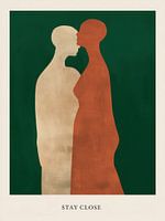 Twee lichamen staan tegenover elkaar, bijna in aanraking, maar nog net met een kleine afstand ertussen. Die ruimte wordt voelbaar. Stay Close gaat hier over spanning tussen nabijheid en terughoudendheid, over het moment vlak voor verbinding. De zachte vormen en aardse kleuren geven het beeld een kalme, intieme aanwezigheid in de ruimte.