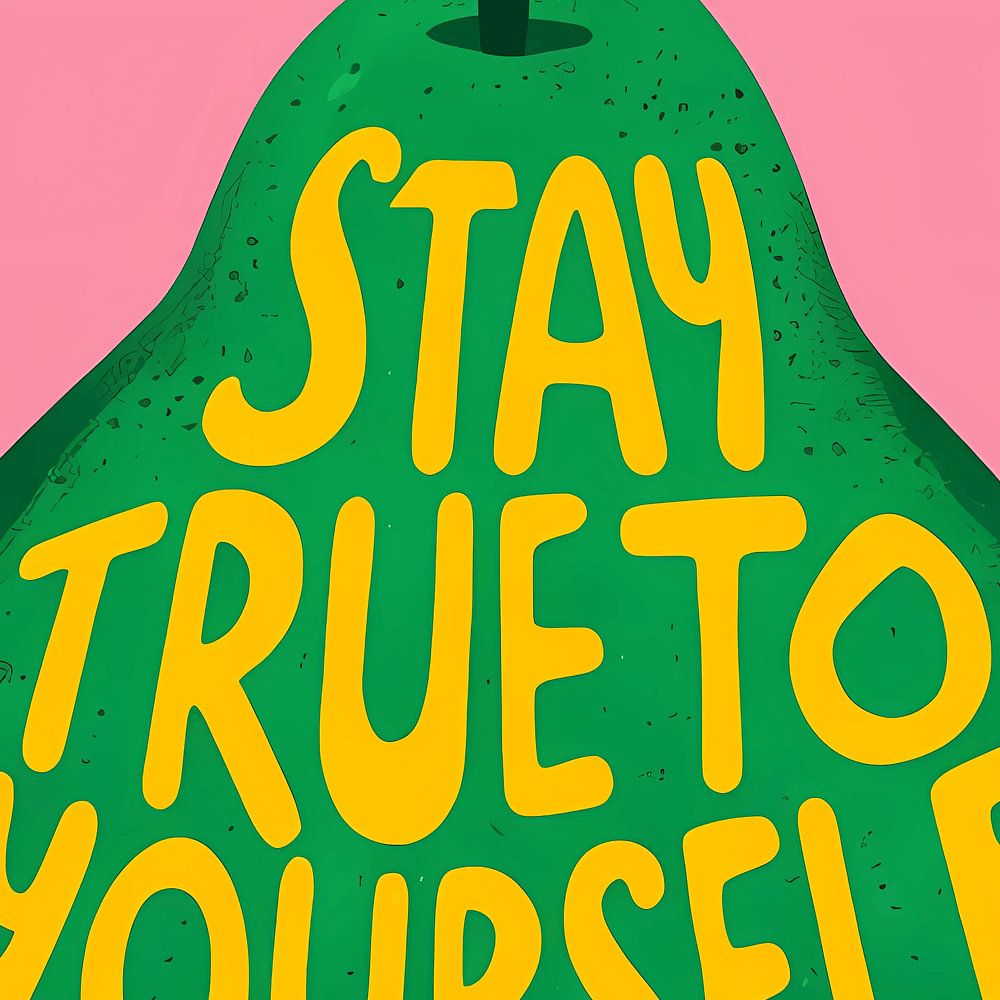 Eine lebendige, handgeschriebene Botschaft "STAY TRUE TO YOURSELF" in sonnigem Gelb hebt sich von einer strukturierten, saftig grünen Birnensilhouette mit einem dunkelgrünen Stiel ab, alles vor einem fröhlichen rosa Hintergrund. Dieses Kunstwerk strahlt Positivität aus und ermutigt zur Selbstakzeptanz.