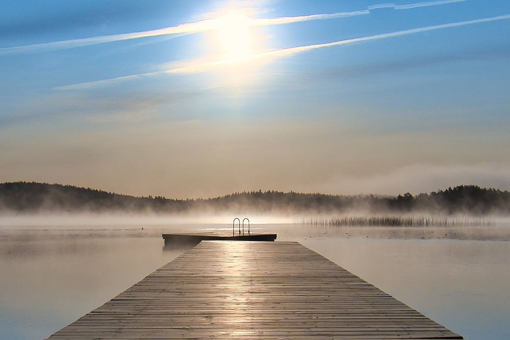 Steg der in einen schwedischen See reicht. Stillleben in der skandinavischen Natur.
