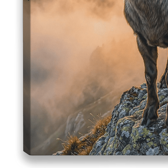 Holen Sie sich die kraftvolle Ruhe der Alpen nach Hause. Dieses Wandbild zeigt einen stolzen Steinbock im goldenen Licht des Sonnenuntergangs – ein Symbol für Freiheit und Erhabenheit.