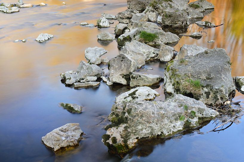 Bestelle das Foto Steine im Fluß in ruhigem Wasser von Ulrike Leone als Reproduktion auf Leinwand, Alu-Dibond, als Poster, Fototapete oder Acrylglasbild.