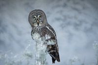 Der Steinkauz zieht vor der Kamera in einer winterlichen Umgebung vorbei