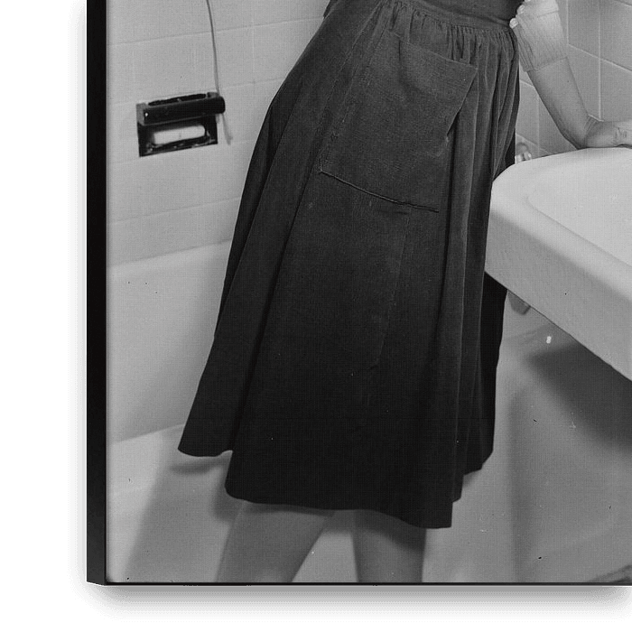 Frau steht vor dem Spiegel einer Toilette auf. Das Mädchen arbeitet während des Zweiten Weltkriegs als Angestellte in der Kommunikation und benutzt das Badezimmer für ihr Make-up.