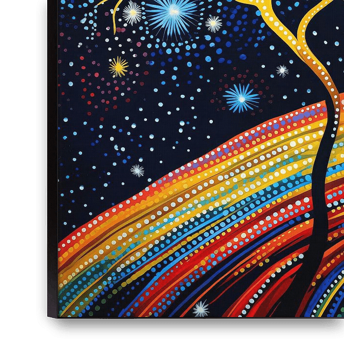 Die von den Aborigines inspirierte pointillistische Serie ist ein tiefes Zeugnis für den Geist der natürlichen Landschaft und ein Teppich künstlerischen Ausdrucks. Diese Kollektion lädt den Betrachter zu einer eindringlichen Pilgerreise durch Leinwände ein, die von uralten Erzählungen und dem rhythmischen Herzschlag der Erde pulsieren.…