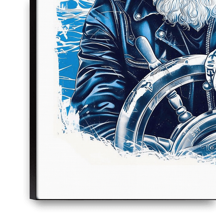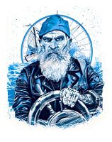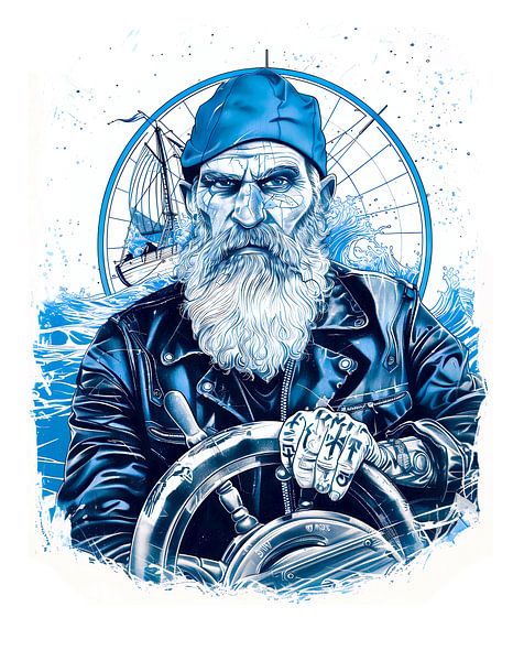 Illustration eines Matrosen mit blauem Halstuch, der ein Schiffsrad steuert. Die Szene enthält maritime Hintergrundelemente und unterstreicht den maritimen Charakter sowie die traditionelle Rolle der Seefahrt.