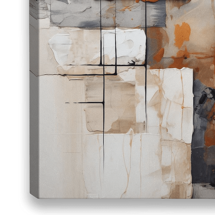 Abstrakte Collage mit groben Steinschichten und linienzeichnenden Elementen in warmen Erdtönen.