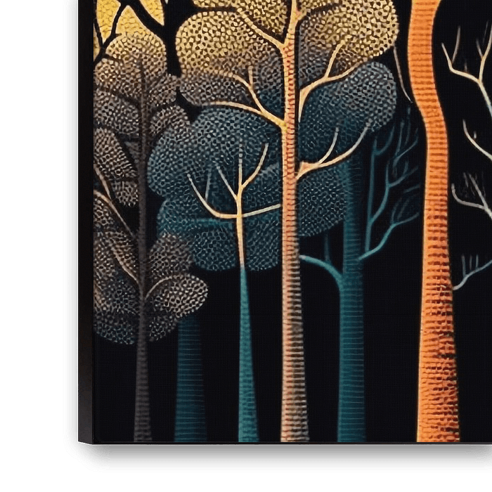 Eine stilisierte Waldillustration mit abstrakten Bäumen mit dunkelbraunem und blauem Blattwerk, entworfen im raffinierten Art-Déco-Stil. Verschlungene geometrische Linien bilden elegante Muster entlang der Äste und Stämme, die sich vor einem tiefschwarzen Hintergrund abzeichnen. Das Licht der goldenen Stunde wirft lange, anmutige Schatten durch das Blätterdach und verstärkt die Tiefe und Raffinesse der Komposition. Dieses Kunstwerk, das sich perfekt für die Wandgestaltung oder die gehobene Inneneinrichtung eignet, verbindet die Natur mit zeitlosem Design.