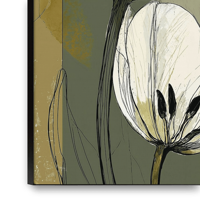 Verschnörkelte und stilisierte Darstellung von zwei Blumen, die subtil vor einem Hintergrund aus Erdtönen wie Olivgrün, Beige und Ocker gezeichnet sind. Die Blumen ähneln Tulpen oder Krokussen und sind mit feinen schwarzen Linien ausgearbeitet, die an einen botanischen Illustrationsstil erinnern. Ihre Blütenblätter sind weiß mit…