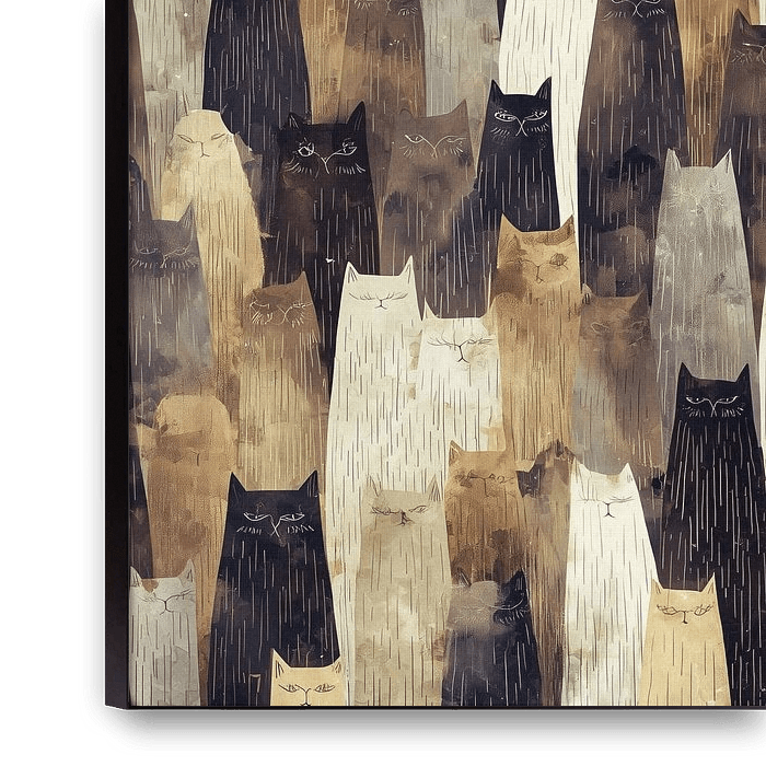 Ein faszinierendes und stimmungsvolles Kunstwerk, in dem eine Ansammlung stilisierter Katzen zu einem harmonischen Muster verschmilzt. Die Vielfalt der Farbtöne – von tiefem Schwarz und warmem Braun bis hin zu sanftem Beige und Creme – sorgt für ein reichhaltiges und vielschichtiges Gesamtbild.