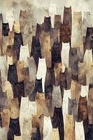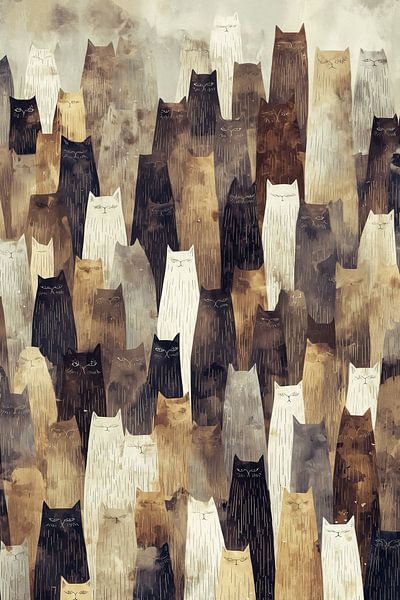 Ein faszinierendes und stimmungsvolles Kunstwerk, in dem eine Ansammlung stilisierter Katzen zu einem harmonischen Muster verschmilzt. Die Vielfalt der Farbtöne – von tiefem Schwarz und warmem Braun bis hin zu sanftem Beige und Creme – sorgt für ein reichhaltiges und vielschichtiges Gesamtbild.