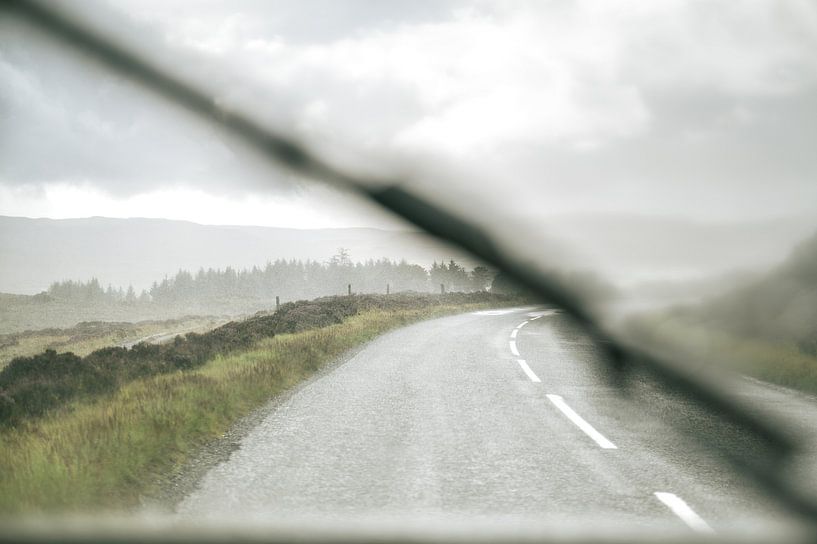 Ein Foto aus dem Auto heraus, aufgenommen in Richtung der regnerischen Landschaft. Die Scheibenwischer bewegen sich hin und her, Kilometer für Kilometer.