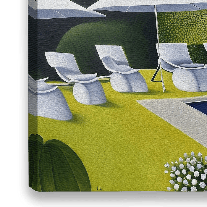 Das Kunstwerk zeigt einen surrealen Garten mit einem verzerrten Schwimmbecken. Um den Pool herum stehen seltsame weiße Liegen und Sonnenschirme. Der Garten selbst ist üppig und tropisch mit Palmenblättern, aber auch entfremdet. Das Ganze schafft eine traumhafte, surreale Atmosphäre, in der die Natur auf besondere Weise verzerrt wurde.…
