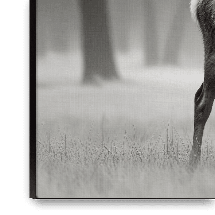 Erleben Sie die Stille der Natur in diesem wunderschönen Schwarz-Weiß-Bild, in dem der majestätische Hirsch die Ruhe eines nebligen Waldes symbolisiert. Die subtilen Graunuancen und die tiefen Kontraste zwischen Licht und Schatten vermitteln ein Gefühl der Ruhe und Gelassenheit. Dieses Motiv, das die Essenz des wilden Lebens ohne die…