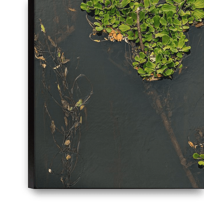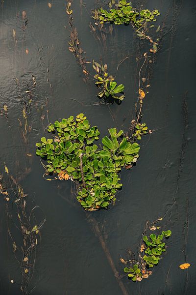 Sanft treibt der Fluss dahin, dunkel und still wie ein gehütetes Geheimnis. Auf seiner Oberfläche ruhen kleine Inseln aus Grün – Wasserpflanzen, die sich wie von unsichtbarer Hand zu zarten Formen zusammenfinden. Ihre Blätter schimmern frisch und lebendig, als würden sie dem schweren Wasser ein leises Versprechen von Hoffnung zuflüstern.