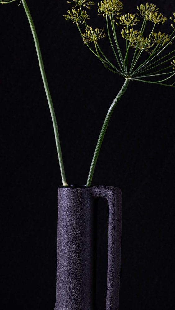 Anthrazitfarbener Krug mit Doldenblütler Dill, auch: Anethum Graveolens genannt. Wunderschön langgestreckte Komposition. Der dunkle Hintergrund in Kombination mit den hellgelben Blüten ist eine hervorragende Farbkombination für einen modernen, aber auch klassischen Look. Ein echter Blickfang an der Wand!