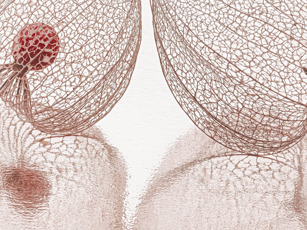 Das Werk: "Stilleben: Innen leer" ist ein Foto von zwei Laternen einer Laternenpflanze, die beide bereits teilweise zerfallen sind und man kann tatsächlich hauptsächlich die Aderstruktur sehen. Bei einer der beiden Laternen ist auch die orangefarbene Beere bereits verschwunden; diese Laterne ist "innen leer".