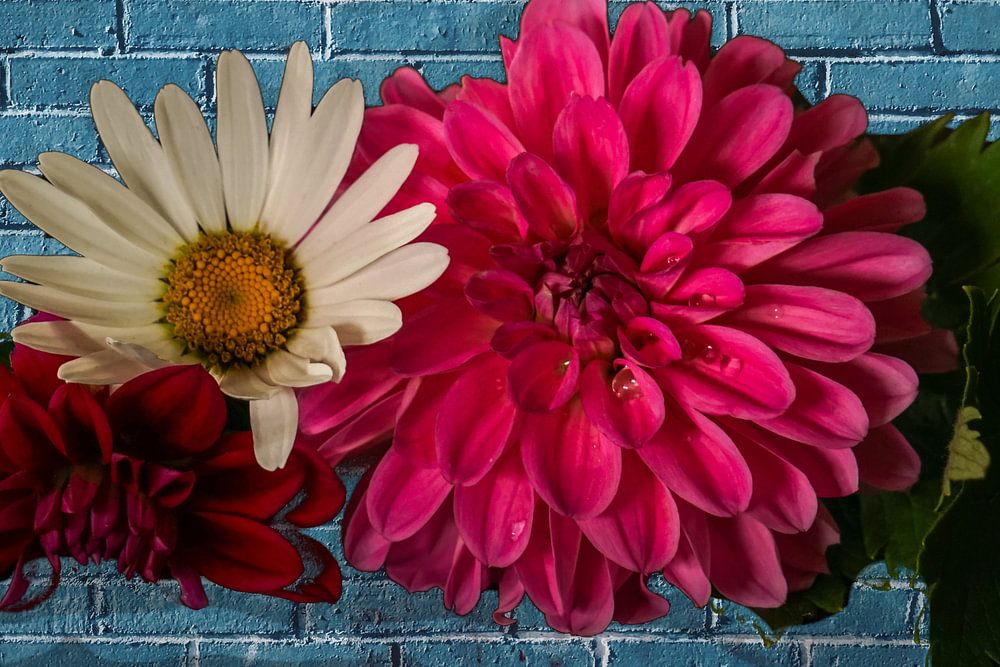 Eine Komposition von Blumen auf einer blauen Wand. Dieses digitale Kunstwerk ist eine Kombination aus Fotografie und digitaler Malerei am Computer.