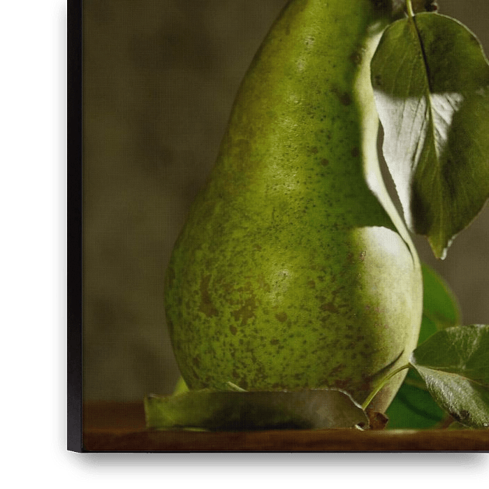 Bestelle dieses Stilleben Stilleben einer Birne mit Blättern von Herman Peters als Reproduktion auf Leinwand, Alu-Dibond, als Poster, Fototapete oder Acrylglasbild.