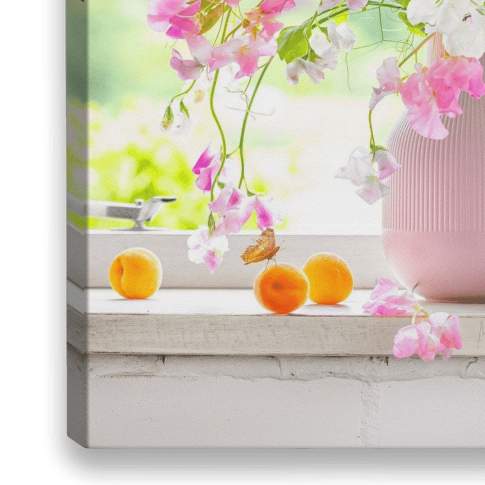 Stillleben vertikal von lathyrus, süße Erbse, in einer alten rosa Vase im Fenster mit einem Blick auf einen ländlichen Hintergrund.