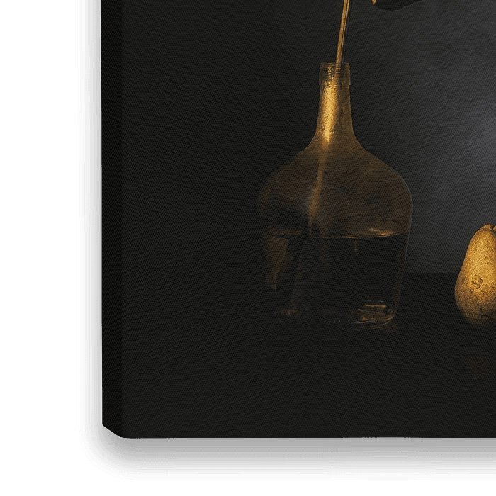 Stilleben mit Lotussaatkasten und Birnen. Ein malerisches, poetisches Foto mitRembrand-Licht . leicht zu montieren wegen der minimalistischen Atmosphäre und des gedämpften Lichts.