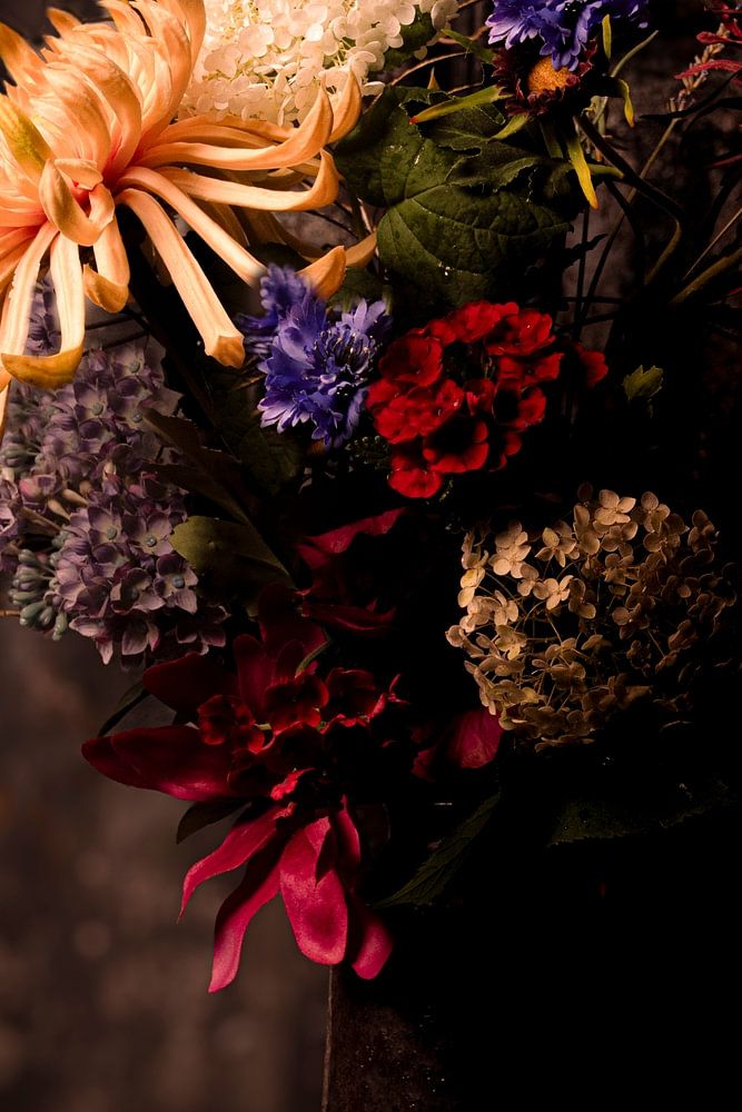 Ein Blumenstillleben, inspiriert von der malerischen Atmosphäre der alten Meister. Die weiche Beleuchtung und die tiefen Schatten vermitteln ein Gefühl von Ruhe, Geheimnis und Zeitlosigkeit. Die verwelkten und blühenden Blumen symbolisieren die Vergänglichkeit des Lebens. Ein Moment der Schönheit in der Stille.